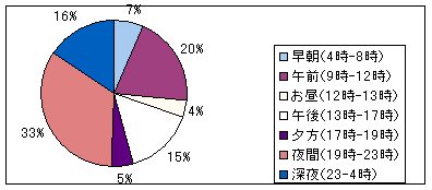 | やはり夜間・深夜が多いですが、他のサイトに比べ閲覧者に主婦が多いため、午前・午後の時間も多いです |